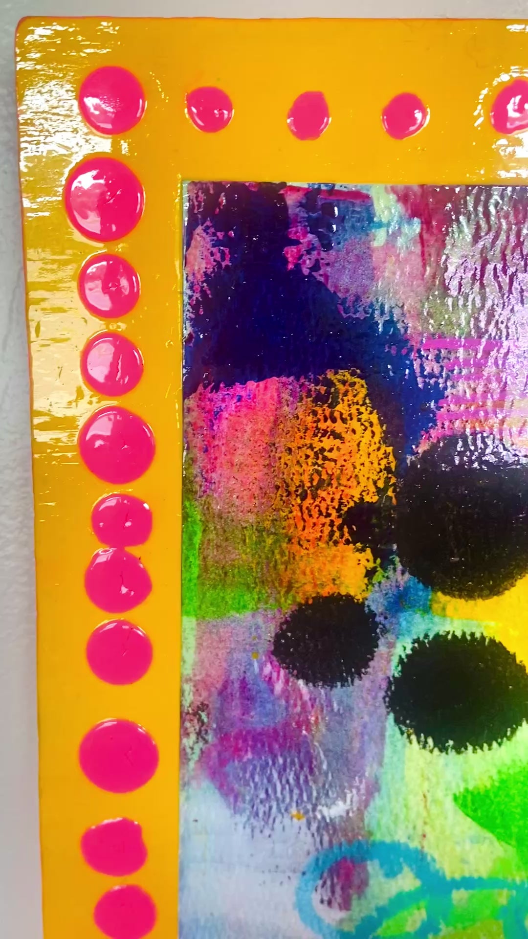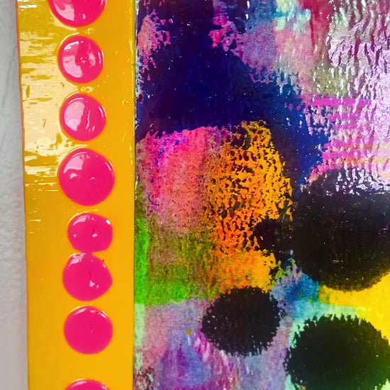 5in x 7in on PAPER mounted to yellow wooden block with pink neon painted sides.